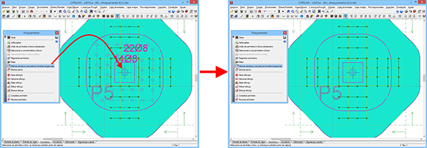 A armadura de reforço calculada pelo CYPECAD em função das tensões tangenciais pontuais pode servir como referência para que o utilizador introduza reforços de punçoamento (armaduras inclinadas a 45º ou armaduras tipo viga). Após a sua introdução, CYPECAD verifica automaticamente o reforço colocado realizando uma verificação de punçoamento segundo critérios normativos. No caso de dispor desse reforço de punçoamento, os reforços por tensões tangenciais pontuais que se encontram dentro da superfície concêntrica ao suporte delimitada pelo perímetro crítico de punçoamento, devem eliminar-se para evitar a duplicidade, quer nos desenhos como na medição. Para isso, foi incluído no CYPECAD uma utilidade que permite eliminar a armadura disposta por tensões tangenciais